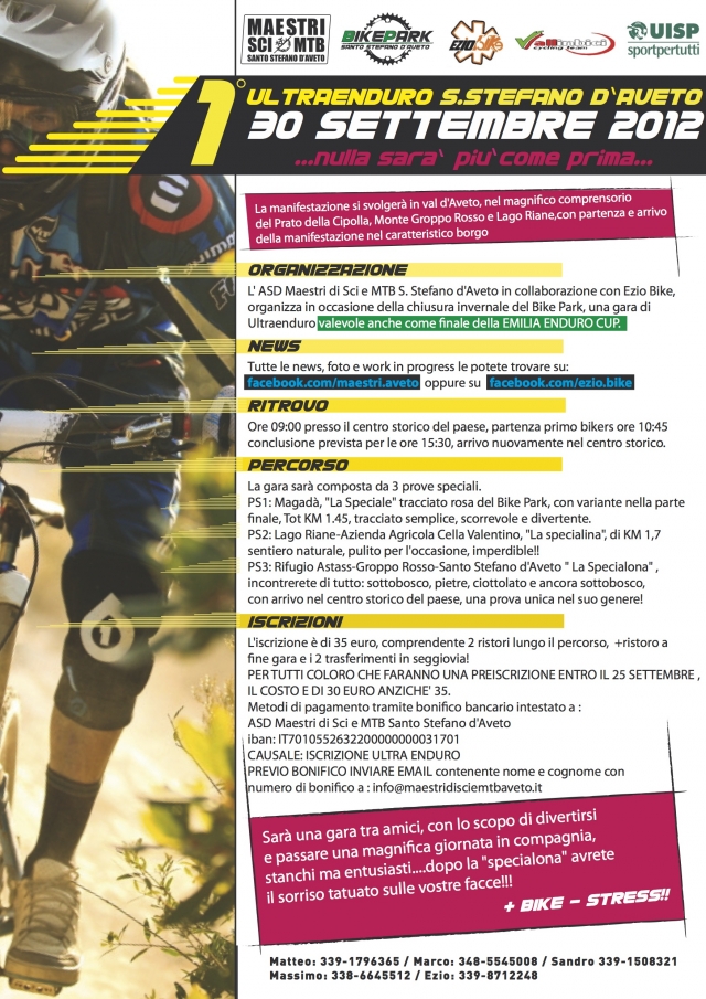 L' ASD Maestri di Sci e MTB S. Stefano d'Aveto in collaborazione con Ezio Bike, organizza in occasione della chiusura invernale del Bike Park, una gara di Ultraenduro valevole anche come finale della EMILIA ENDURO CUP.
