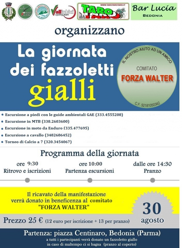 Seconda edizione della Giornata dei Fazzoletti Gialli a Bedonia, dedicata allo sport ma soprattutto alla solidarietà e alla beneficenza. Quest’anno il ricavato della manifestazione sarà devoluto all’associazione “FORZA WALTER” per aiutare e finanziare le cure di Walter Belli, biker e campione valtarese, in seguito al grave incidente che ha subito.
